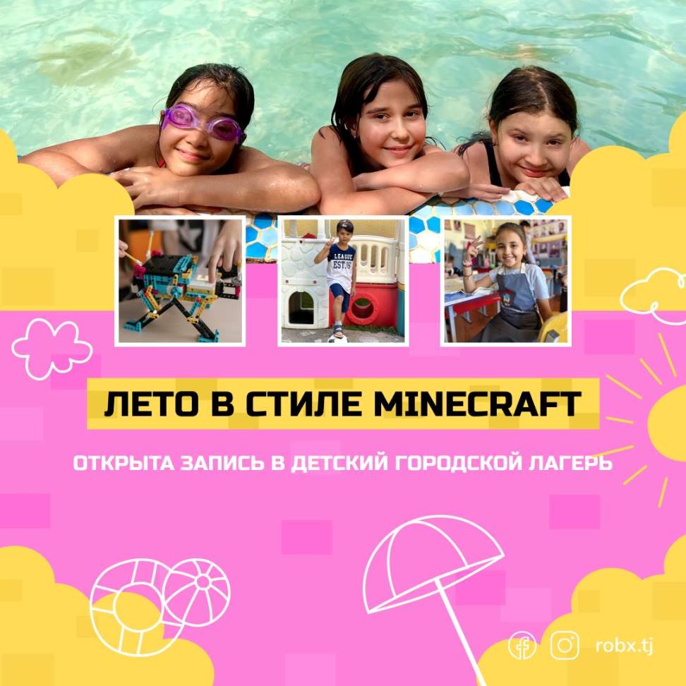 Тематика в этом году – игра «Minecraft». В программе: робототехника, творческие мастер-классы, выездные мероприятия, игры на свежем воздухе, а также плавание в бассейне.