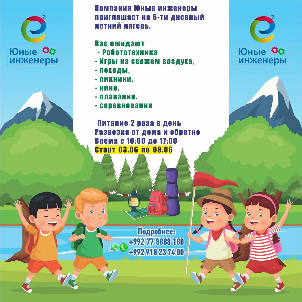 Это 6-дневный лагерь с 3 июня по 8 июня, где ребенок погрузится в мир робототехники. Кроме того, его ждут: игры на свежем воздухе, походы и пикники, кинопоказы под открытым небом, плавание, весёлые соревнования и командные игры.