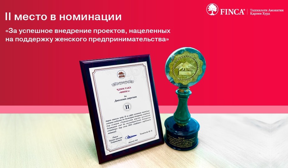 Микрокредитная депозитная организация «ФИНКА Таджикистан» получила признание за свою работу по расширению экономических возможностей для женщин Таджикистана, заняв второе место в номинации «За успешное внедрение проектов, направленных на поддержку женского предпринимательства» в рамках конкурса «Лучшая финансово-кредитная организация по обслуживанию женщин предпринимателей».