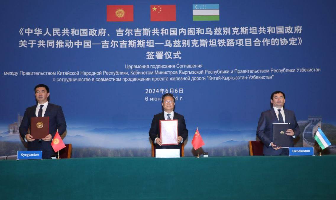 В Пекине 6 июня состоялась официальная церемония подписания соглашения о сотрудничестве в совместном продвижении проекта железной дороги «Китай — Кыргызстан — Узбекистан» между правительствами трех стран. Об этом сообщает пресс-служба президента Узбекистана.