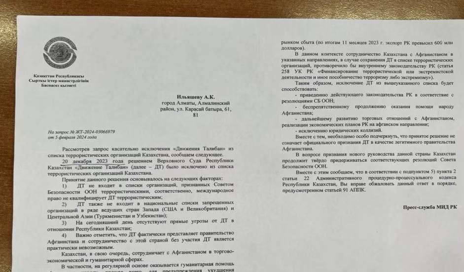 Ильяшев озвучил «обоснования», как он сообщил, полученные из ответа министерства иностранных дел Казахстана. В частности, по его словам, во внешнеполитическом ведомстве ему заявили, что «движение «Талибан» фактически представляет правительство Афганистана, и сотрудничество с этой страной без участия движения «Талибан» является практически невозможным».
