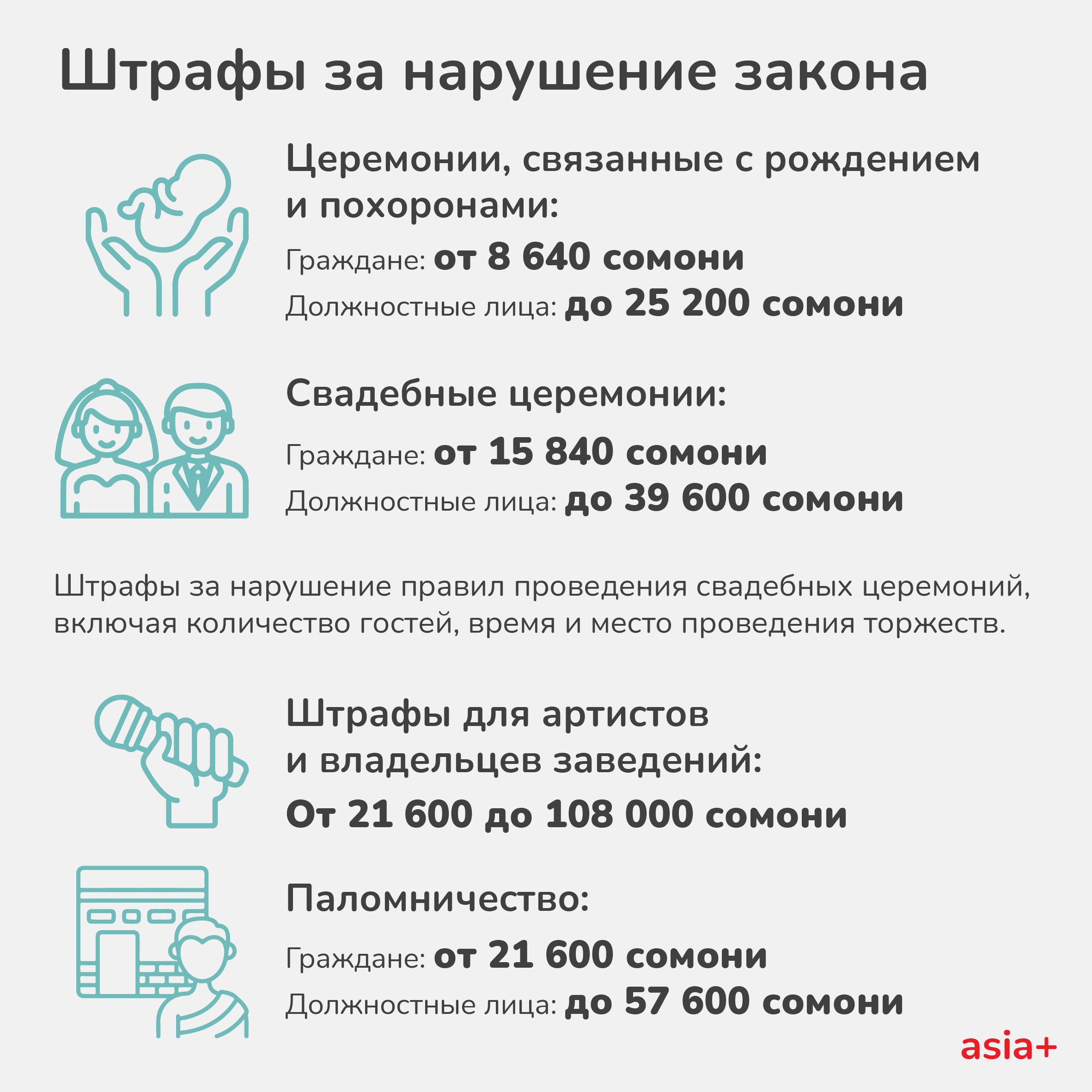 Также вступили в силу и поправки к Кодексу об административных правонарушениях, согласно которым установлены штрафы за нарушения того или иного пункта вышеуказанного закона — они достигают 100 тысяч сомони.
