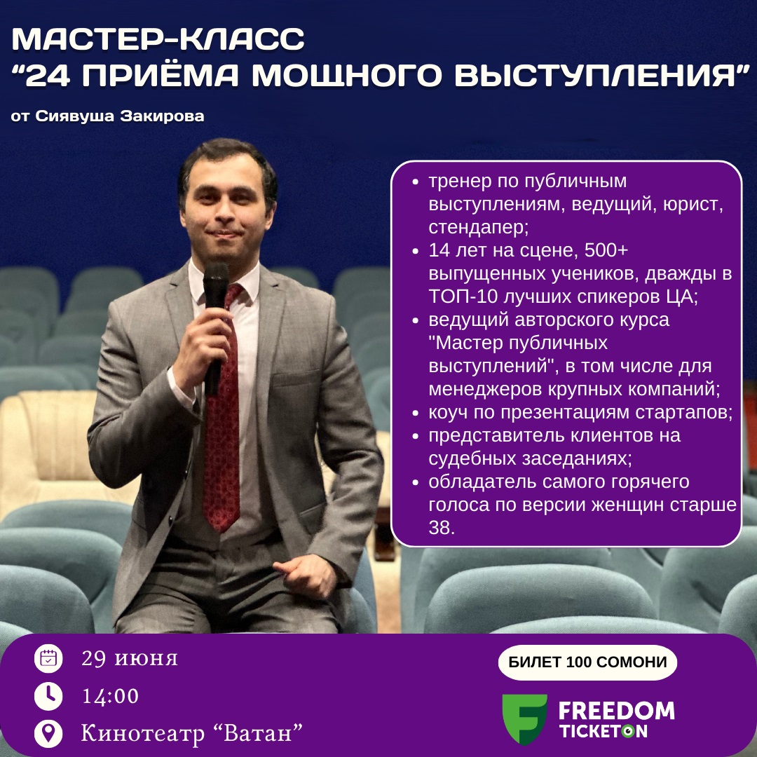 В кинотеатре «Ватан» 29 июня в 14:00 стендапер Сиявуш Закиров проведёт мастер-класс «24 приема успешного выступления» для тех, кто хочет научиться смело говорить на публике.