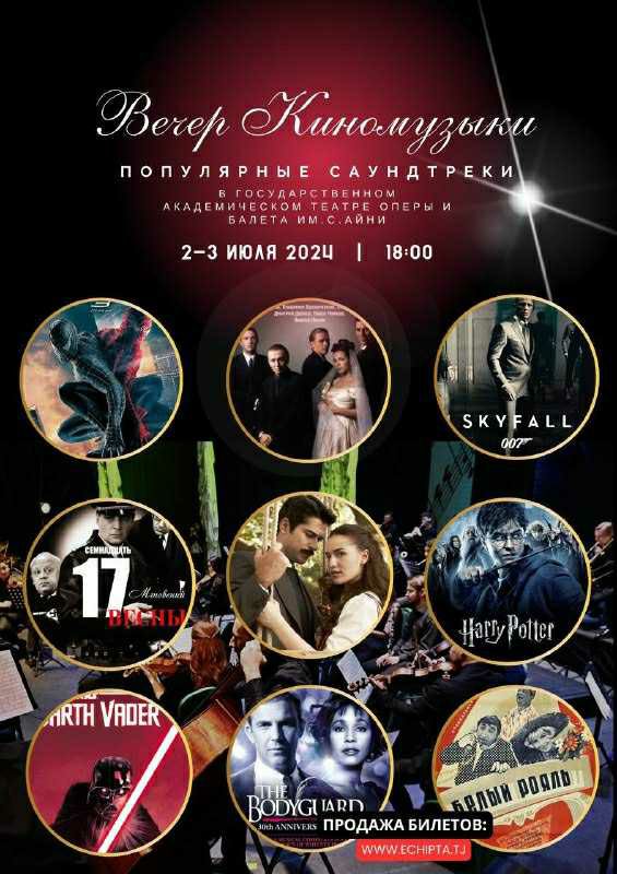В театре оперы и балета им. С. Айни 2 и 3 июля в 18:00 пройдет Вечер киномузыки, на котором в живом исполнении симфонического оркестра прозвучат саундтреки к голливудским, советским и турецким фильмам.