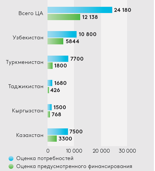 Среди стран региона наибольший дефицит финансирования ожидается в Узбекистане – $826 млн в год, или почти $5 млрд в 2025–2030 годах.