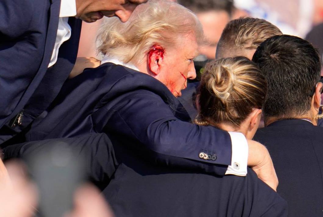 Сразу же после начала стрельбы Трамп пригнулся к трибуне, к нему подбежали телохранители и увели его. Перед уходом политик помахал рукой, сжатой в кулак. У Трампа было окровавлено правое ухо.