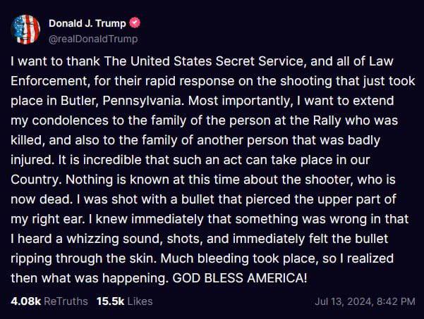 «Президент Трамп благодарит сотрудников правоохранительных органов и экстренных служб за быструю реакцию во время этого вопиющего события. С ним все в порядке», — сказал представитель Трампа Стивен Чанг через некоторое время после стрельбы.