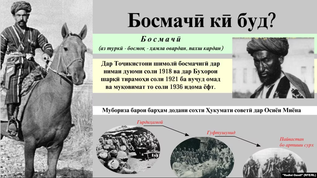 Дело в том, что ближе к середине 1920-х гг, с образованием Таджикской республики, в обществе началось политическое размежевание: таджики организовывали отряды самоохраны (краснопалочников), которые защищали кишлаки и райцентры от внезапных нападений шаек. Появилось новое — постджадидское поколение руководителей республики из низов, всецело преданных Советской власти, включая горцев Каратегина, Дарваза и Бадахшана таких как Нусратулло Махсум и Шириншо Шотемур.