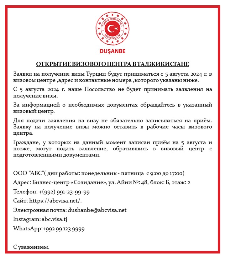 В Таджикистане заявки на получение визы Турции с 5 августа будут приниматься в визовом центре. Об этом сообщило посольство Турции в Таджикистане на своей странице в Facebook.