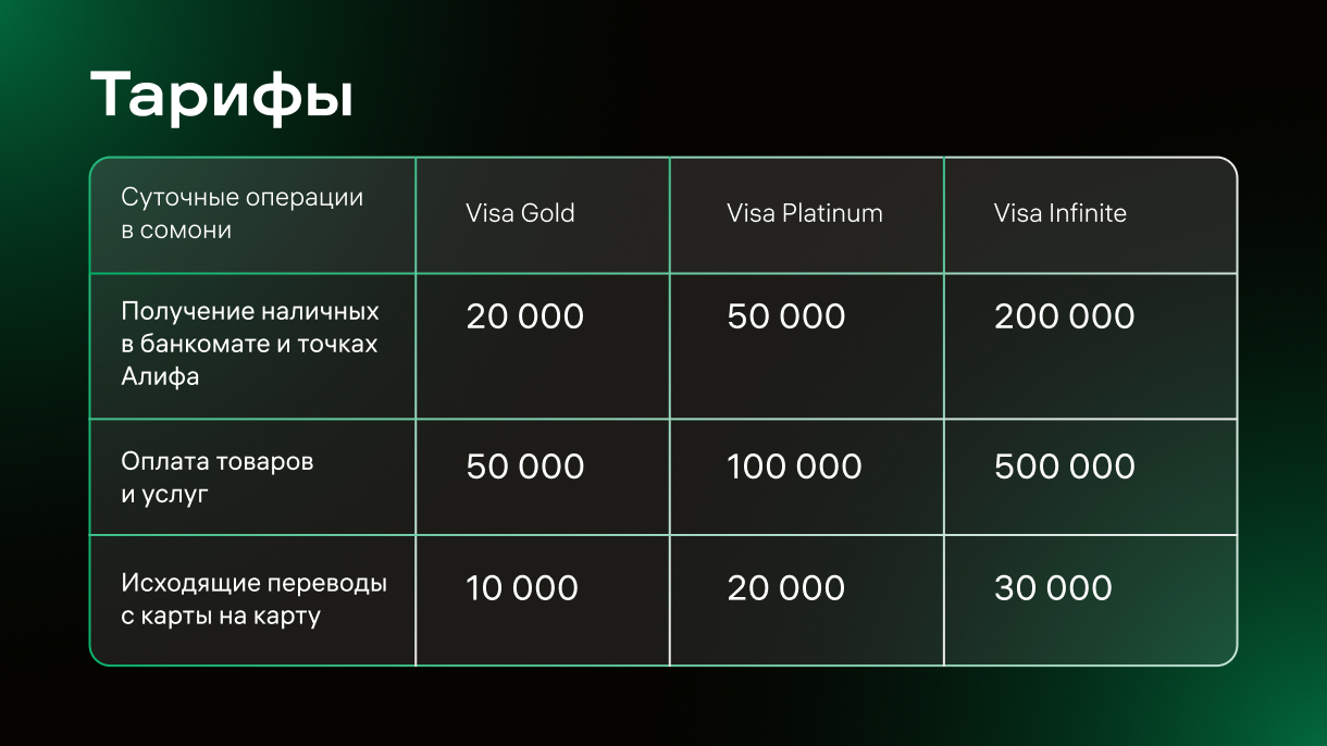 Любую из карт — Visa Gold, Platinum и Infinite — можно оформить в приложении Alif Mobi или на сайте: https://alf.tj/kortishumo.