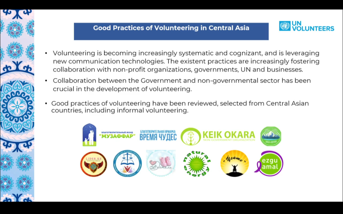Во время презентации была отмечена важная роль действующего законодательства государств региона, регулирующего волонтерское движение. Речь также шла о поддержке волонтерства, роли и вкладе волонтеров в продвижение экономической, социальной и культурной сфер общества, в реализации Целей устойчивого развития до 2030 года, выявлении лучших практик волонтерства в государствах Центральной Азии, включая выводы и предложения.