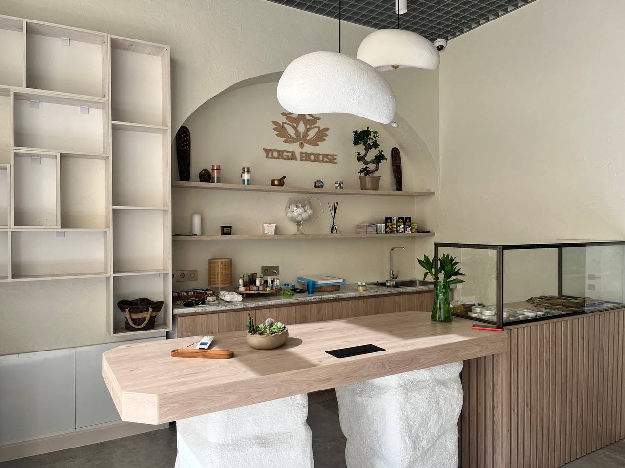 На ресепшене можно купить палочки для медитаций или эфирные масла, привезенные с Бали. Само помещение достаточно светлое, декор — дерево и камень. Помещение выглядит современно и минималистично.