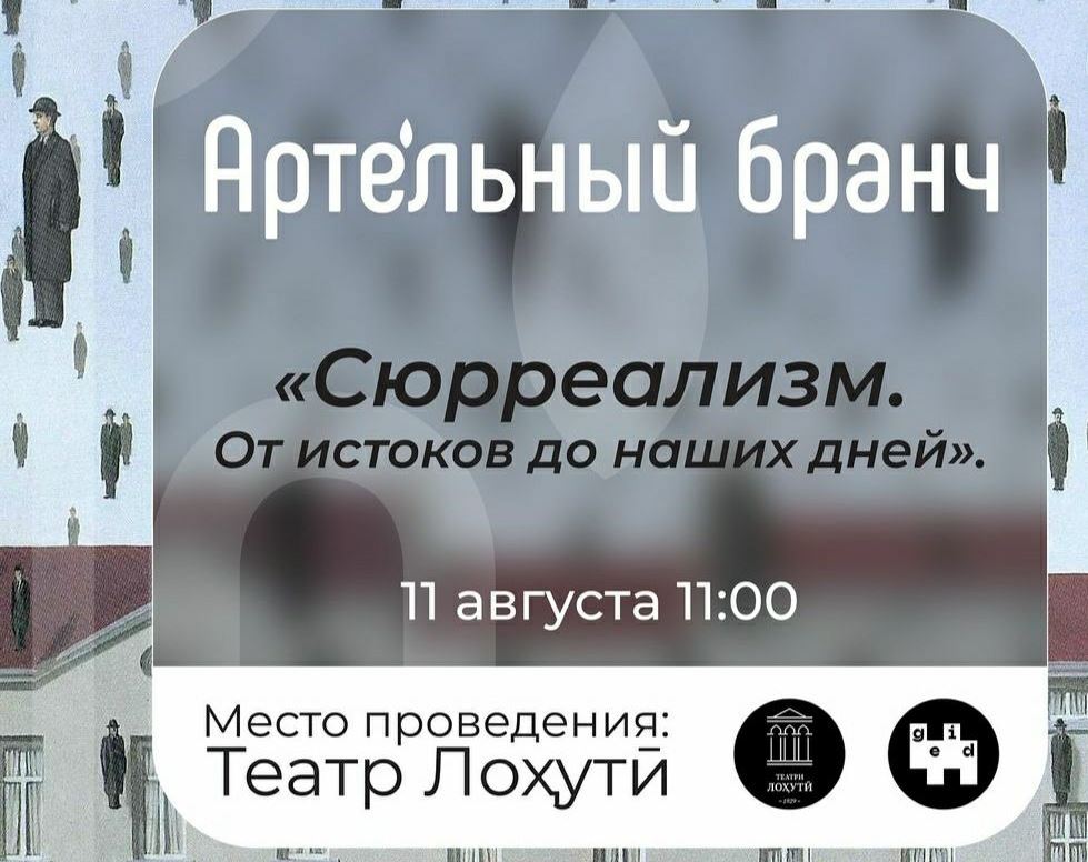 В здании театра Лахути 9 августа с 19:00 до 21:00 пройдёт артельный вечер «Сюрреализм. От истоков до наших дней». Дата выбрана не случайно, так как именно в этот день 100 лет назад был опубликован первый манифест сюрреализма, ставший стартовой точкой для одного из самых ярких художественных движений ХХ и ХХІ веков.