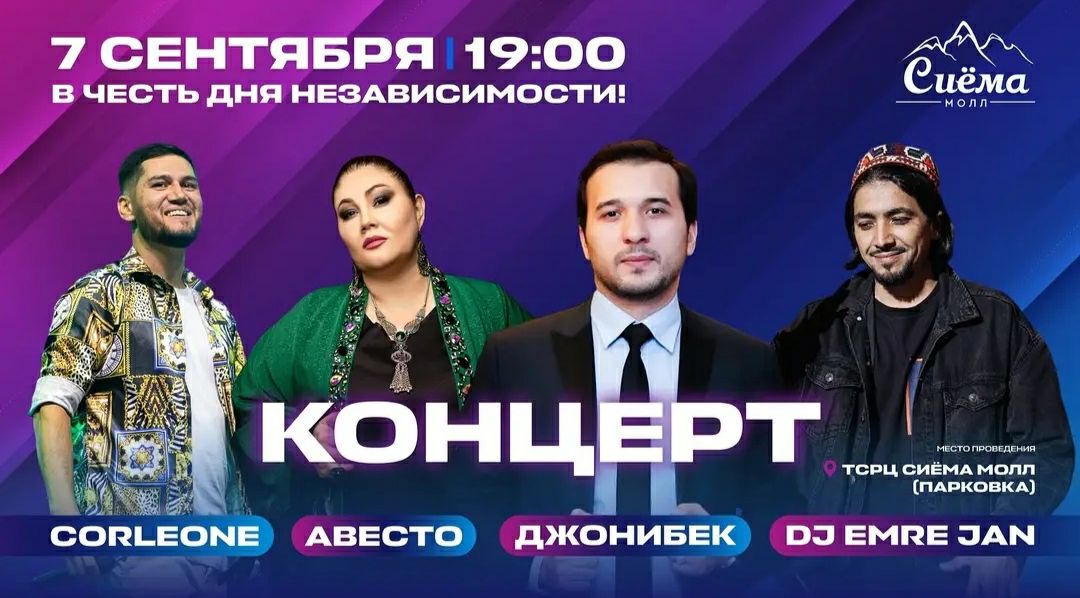 На паркинге ТРЦ «Сиёма Молл» 7 сентября в 19:00 состоится большой праздничный концерт, приуроченный ко Дню независимости Таджикистана.