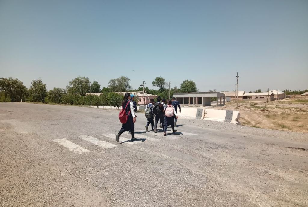 Это основная дорога, ведущая в центр Зафарабадского района, и машины проезжают по ней на высокой скорости. В прошлом году машина сбила ребенка одного из экологических мигрантов при переходе дороги и подросток сломал ногу. Для строительства школы в селе Джавони выделена земля, но неизвестно, когда она будет построена.