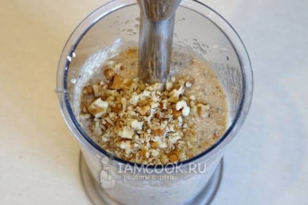 Добавляем мёд и имбирь, а также йогурт. В последний раз взбиваем все блендером и посыпаем орешками. Творожный смузи с дыней готов!