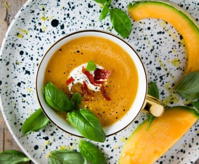 Первое блюдо, где главным ингредиентом выступает дыня, холодный дынный суп. Фишка этого супа в простоте его приготовления, он получается ярким, чем привлечет внимание гостей и не оставит равнодушным никого своим вкусом.