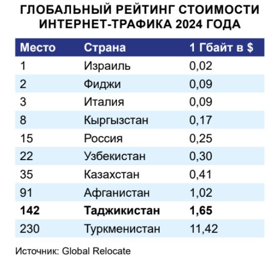 Для сравнения, в Кыргызстане 1 Гбайт в среднем стоит $0,17 (8-е место в мире), в Узбекистане – $0,30 (22-е место), в Казахстане – $0,41 (35-е место). Иными словами, Интернет в Таджикистане почти в 9,5 раз дороже, чем в Кыргызстане, в 5,5 раз – чем в Узбекистане и в 4 раза – чем в Казахстане.