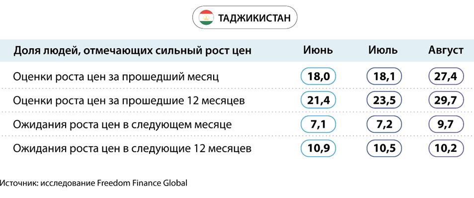 Инфляционные ожидания в Таджикистане показали не такой большой рост: 9,7% жителей страны ждут очень сильного роста цен в ближайший месяц, тогда как в июле таких было 7,2%. А в ожиданиях от следующих 12 месяцев доля пессимистов упала с 10,5 до 10,2%.