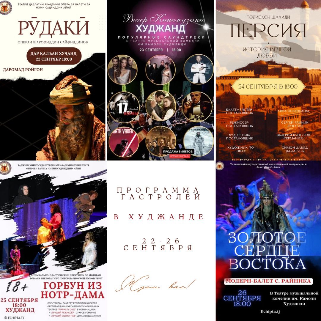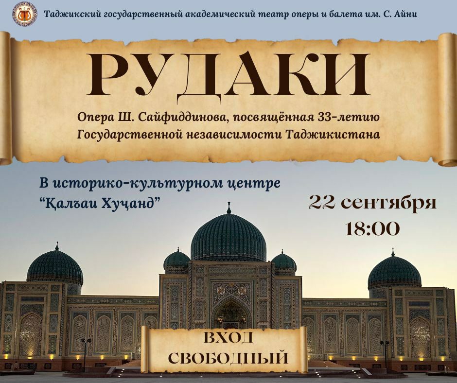 В историко-культурном комплексе «Қалъаи Хуҷанд» 22 сентября в 18:00, в день рождения Рудаки состоится показ национальной оперы Шарофиддина Сайфиддинова «Рудаки», которая станет ярким началом гастролей артистов Государственного академического театра оперы и балета им. С. Айни в Худжанде.
