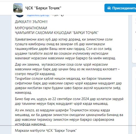 Открытое акционерное общество «Барки точик» опубликовала на своей странице в Facebook обращение к населению страны с предупреждением о том, что в стране введены ограничения на поставку электроэнергии с 22 сентября.