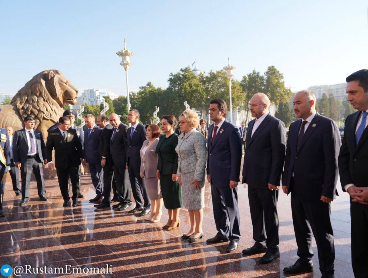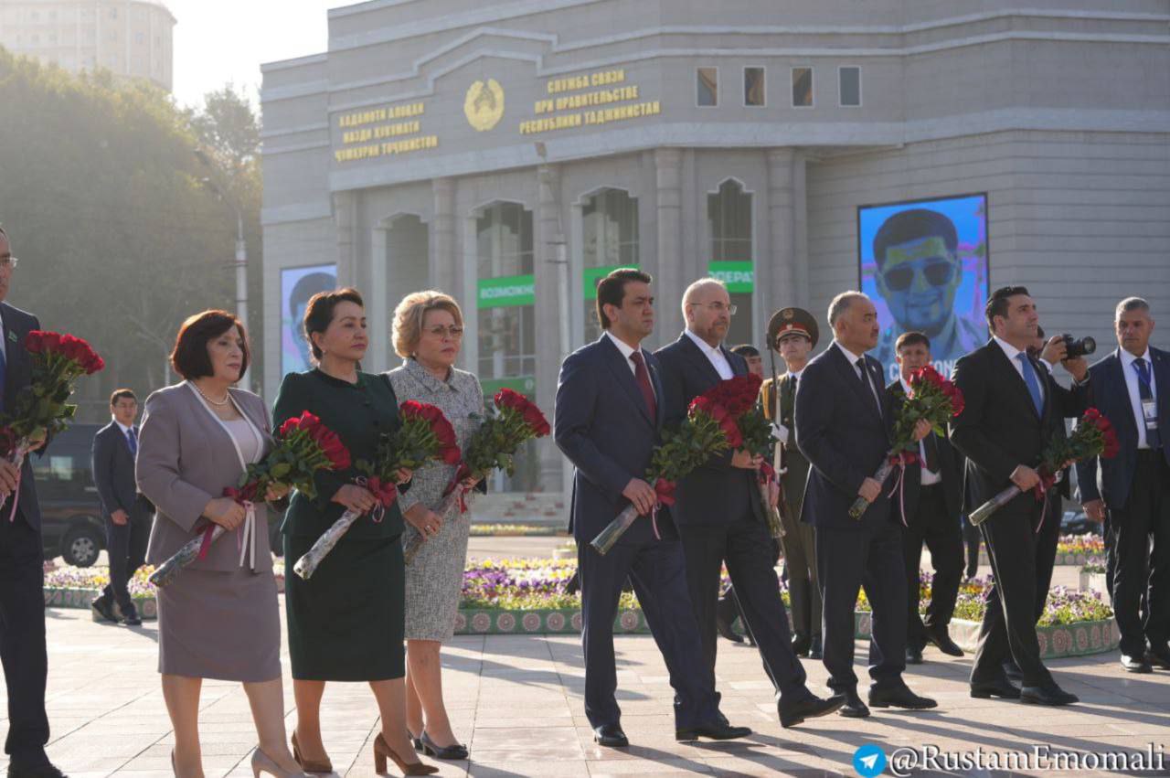 Перед началом конференции спикер верхней палаты таджикского парламента Рустам Эмомали вместе с главами парламентских делегаций "в знак уважения и дани прошлому таджикского народа" возложили венок к подножию памятника Исмоила Сомони.