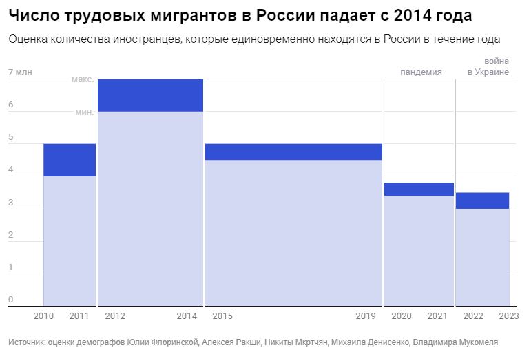 В 2022-2023 годах в России одновременно в течение года трудились примерно 3–3,5 млн иностранцев, подсчитала демограф Юлия Флоринская в своем исследовании. Демограф Алексей Ракша сказал «Новой газете – Балтия», что этого мало, и их должно было «больше, чем когда бы то ни было». А пик числа мигрантов был достигнут в 2012-2014 годах: тогда в России одновременно в течение года легально и нелегально работали до 6-7 млн иностранцев (это подсчеты Елены Варшавской и Михаила Денисенко из Высшей школы экономики, а также данные Сергея Рязанцева из РАН).