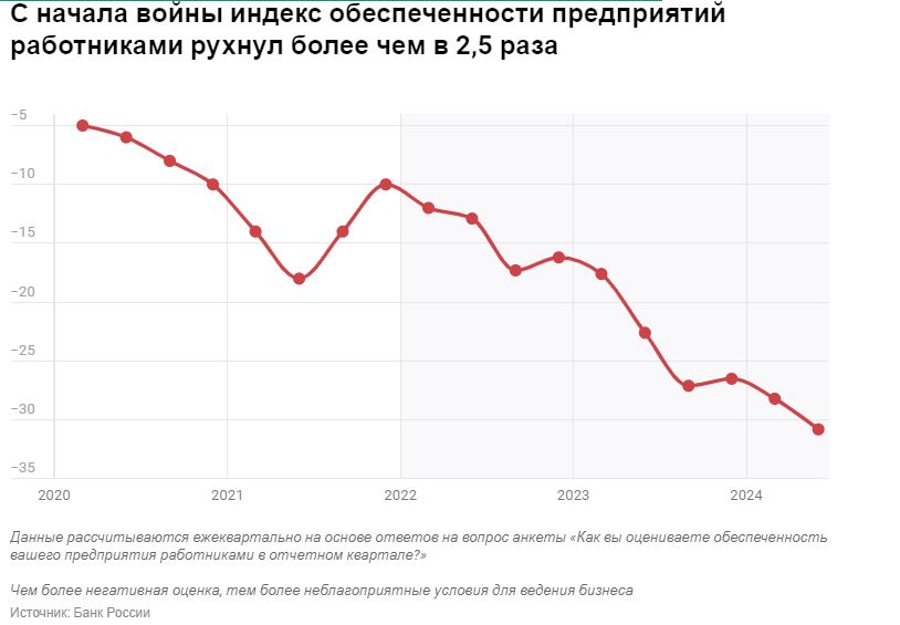 Тем временем российская экономика страдает от беспрецедентного дефицита кадров. По итогам второго квартала 2024-го потребность работодателей в работниках достигла рекордных 2,7 млн человек, свидетельствуют данные Росстата, который делает такие выводы, основываясь на обращения предприятий в центры занятости.