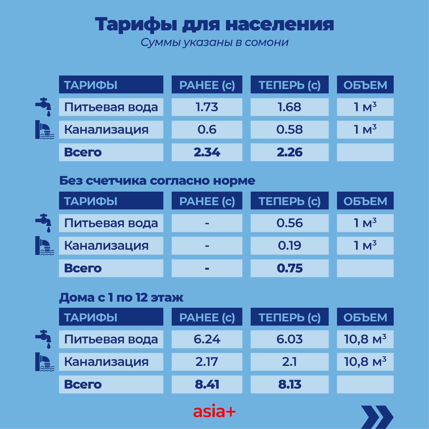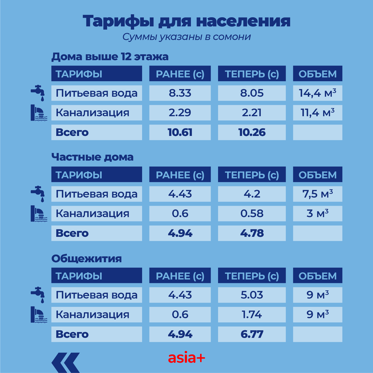 Но, понижение ставки НДС на 1% повлияло на оплату услуг водоснабжения со стороны населения. Например, за использование 1 м3 питьевой воды и услуги канализации абоненты будут платить 2 с 26 дирам вместо прежних — 2 сомони 34 дирам. Остальные цифры приведены в инфографике ниже.