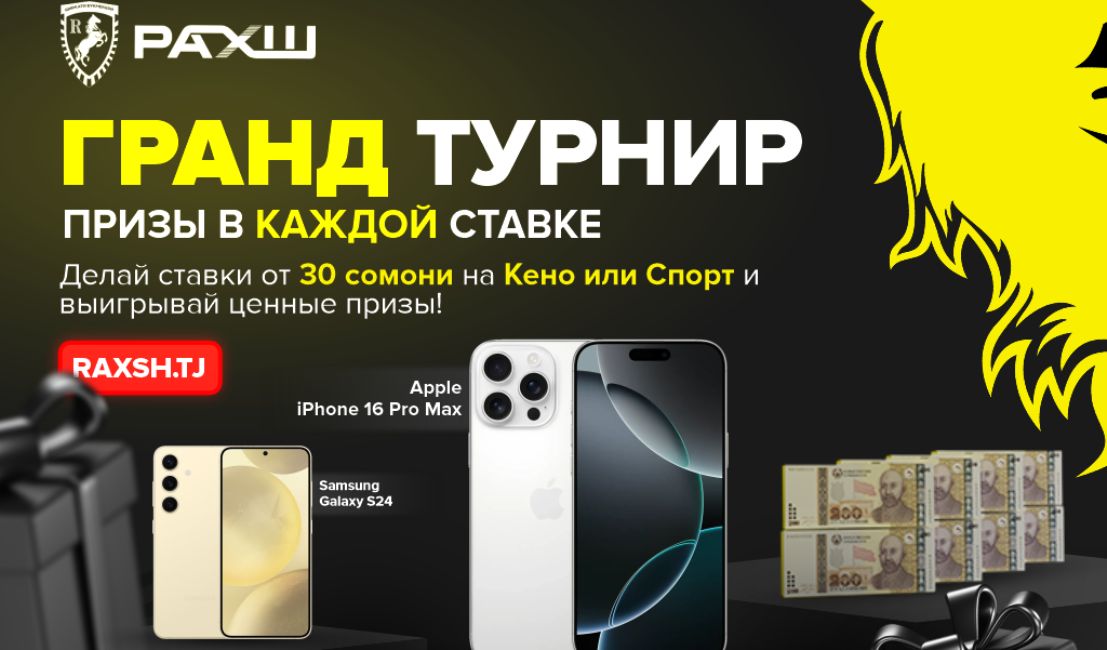 iPhone 16 Pro Max, Samsung S24, а также денежные суммы по пять, три, две и одну тысячу сомони. Призы получают 20 человек, а розыгрыш состоится в прямом эфире на странице «Рахш» в Instagram: 10 января.
