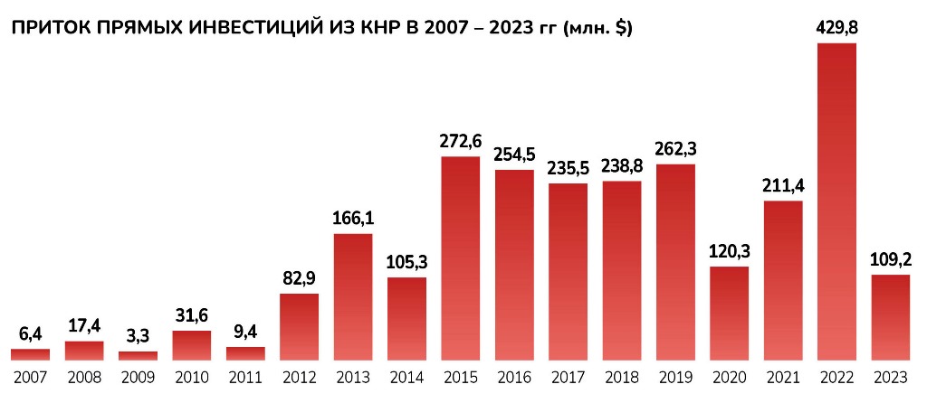 Первые прямые инвестиции из Поднебесной поступили в 2007 году в размере $6,4 млн. В течение следующих четыре года приток оставался примерно на таком же незначительном уровне. Значительный рост начался с 2012 года ( почти $83 млн), а рекордный объем китайских ПИ поступил в 2022 году (около $430 млн).