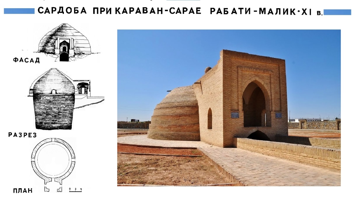 Так сардоба при караван-сарае Рабат и Малик (X-XI вв.) между Бухарой и Самаркандом имела ступенчатый купол диаметром 21,1 м, перекрывающий углубленную в землю и заполненную водой кирпичную цистерну.