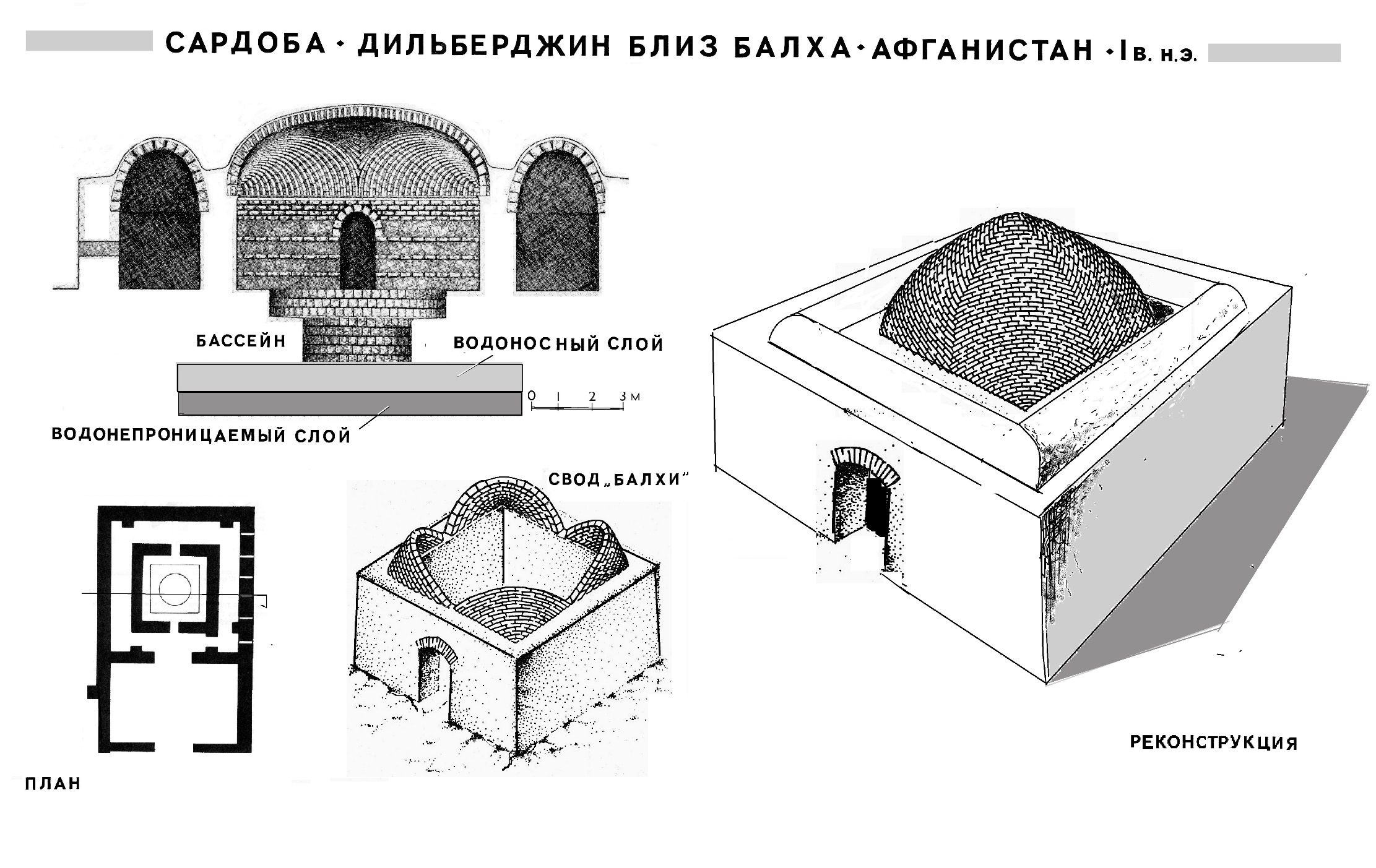 Хорасанские и центральноазиатские сардоба имели, как правило, круглый план, но древнейшая сардоба, обнаруженная при раскопках бактрийского города Дильберджин на севере Афганистана близ Балха (I в. н. э.), имела квадратный план и перекрывалась куполом получившем название «балхи», указывая на то, что происхождение конструкции купола и его название связано с городом Балх.