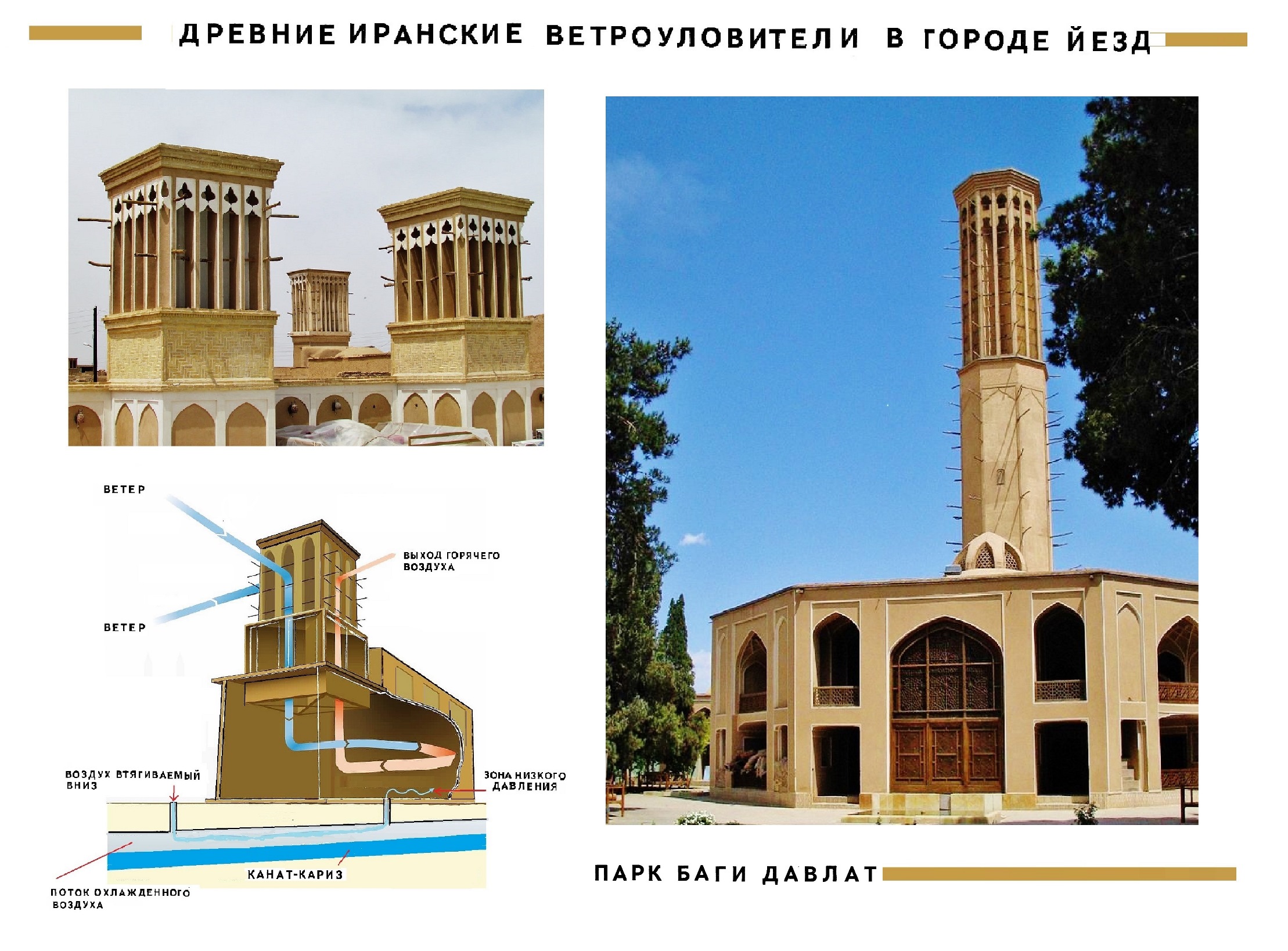 В городах Ирана для создания микроклимата изобрели оригинальную конструктивную систему кондиционирования зданий, так называемые бадгиры (дословно, ловящий ветер), получившие позже широкое распространение в странах Ближнего и Среднего Востока, Пакистане и Северной Африки.