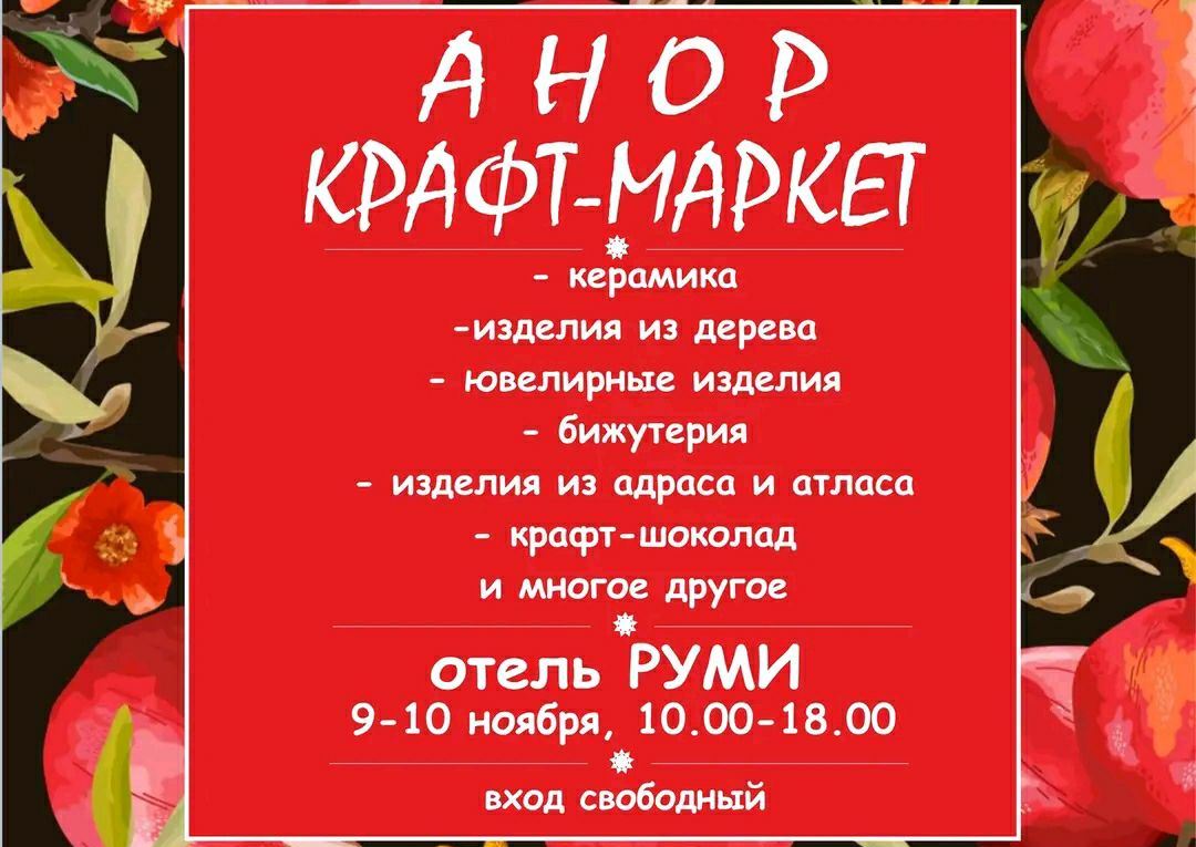 В отеле «Руми» 9 ноября с 10:00 до 18:00 состоится традиционная ярмарка-продажа ремесленных изделий «Анор-Крафт-Маркет» – самое яркое, сочное и вкусное осеннее мероприятие с участием народных умельцев.