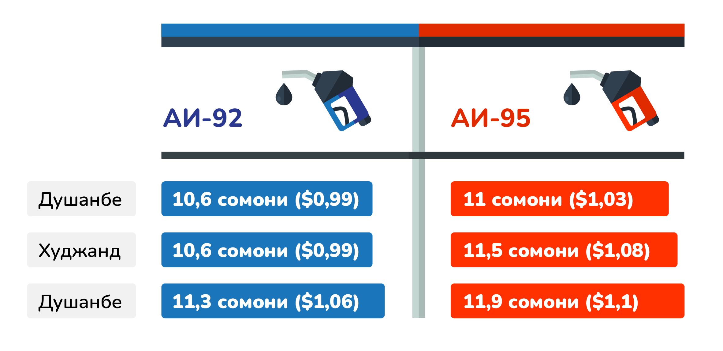 Средняя стоимость бензина по республике составляет около 11 сомони ($1,03).