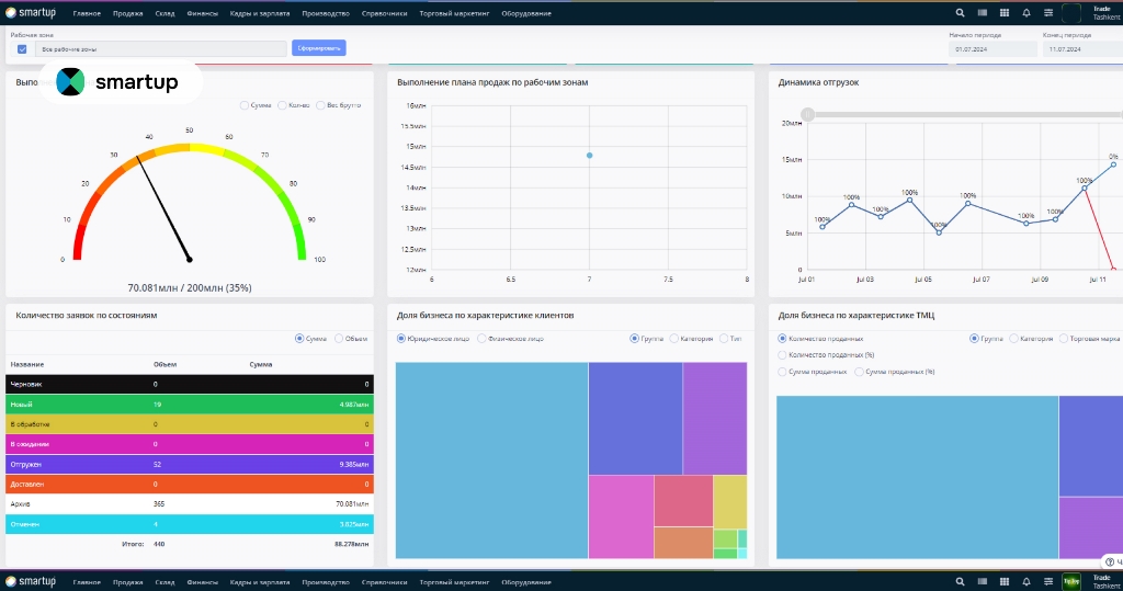 В основе платформы Smartup лежат три главных принципа: простота, гибкость и безопасность. Система объединяет процессы компании в единую цифровую цепочку, что позволяет минимизировать ошибки, сократить рутинные операции и обеспечить прозрачность на всех уровнях бизнеса.
