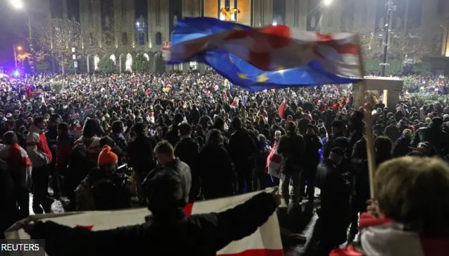 Протесты в Тбилиси спонтанно начались в четверг, вскоре после того, как премьер-министр Грузии Ираклий Кобахидзе заявил, что страна замораживает переговоры о вступлении в Евросоюз до 2028 года — и на этот же срок замораживает все совместные программы с ЕС.