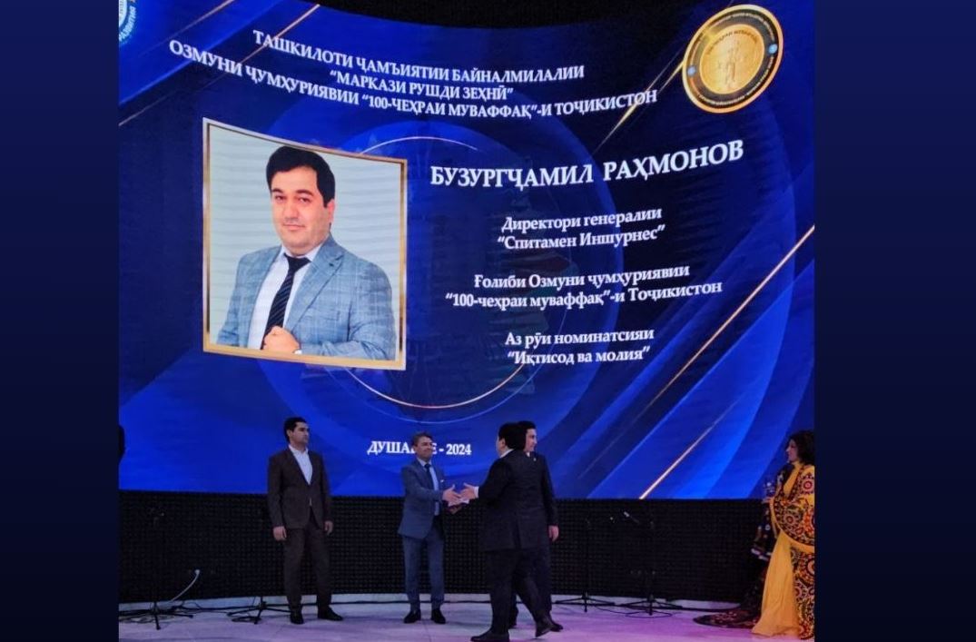 Награду в номинации «Экономика и финансы» по решению республиканской конкурсной комиссии ежегодной премии «Топ 100 – успешных людей Таджикистана» получил директор «Спитамен Иншуренс» Бузургджамил Рахмонов за свой вклад в развитие страхового рынка.