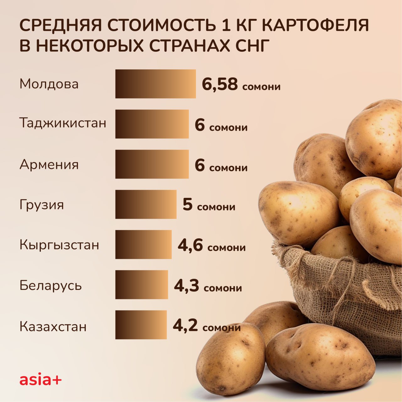 В ноябре 2024 года в Таджикистане средние цены на картофель снизились на 12,2% по сравнению с аналогичным периодом прошлого года, составив 5-6 сомони за килограмм в Душанбе и 4,20-5,80 сомони в регионах.