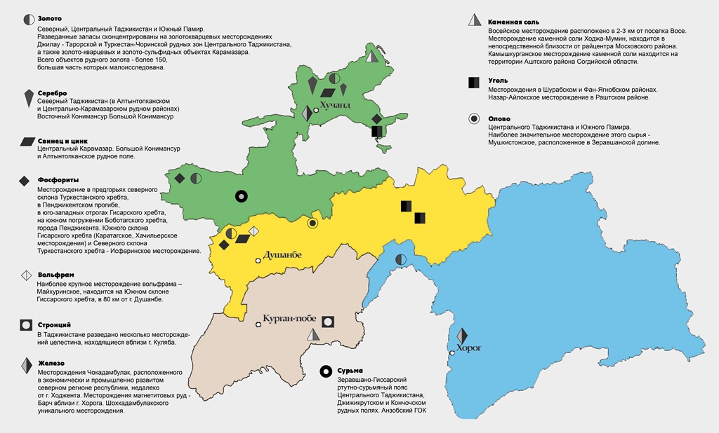 «Таджикистан – одна из богатейших стран мира по запасам серебра, бора, сурьмы, ртути, каменной соли, драгоценных и поделочных камней, других полезных ископаемых», — утверждает он.