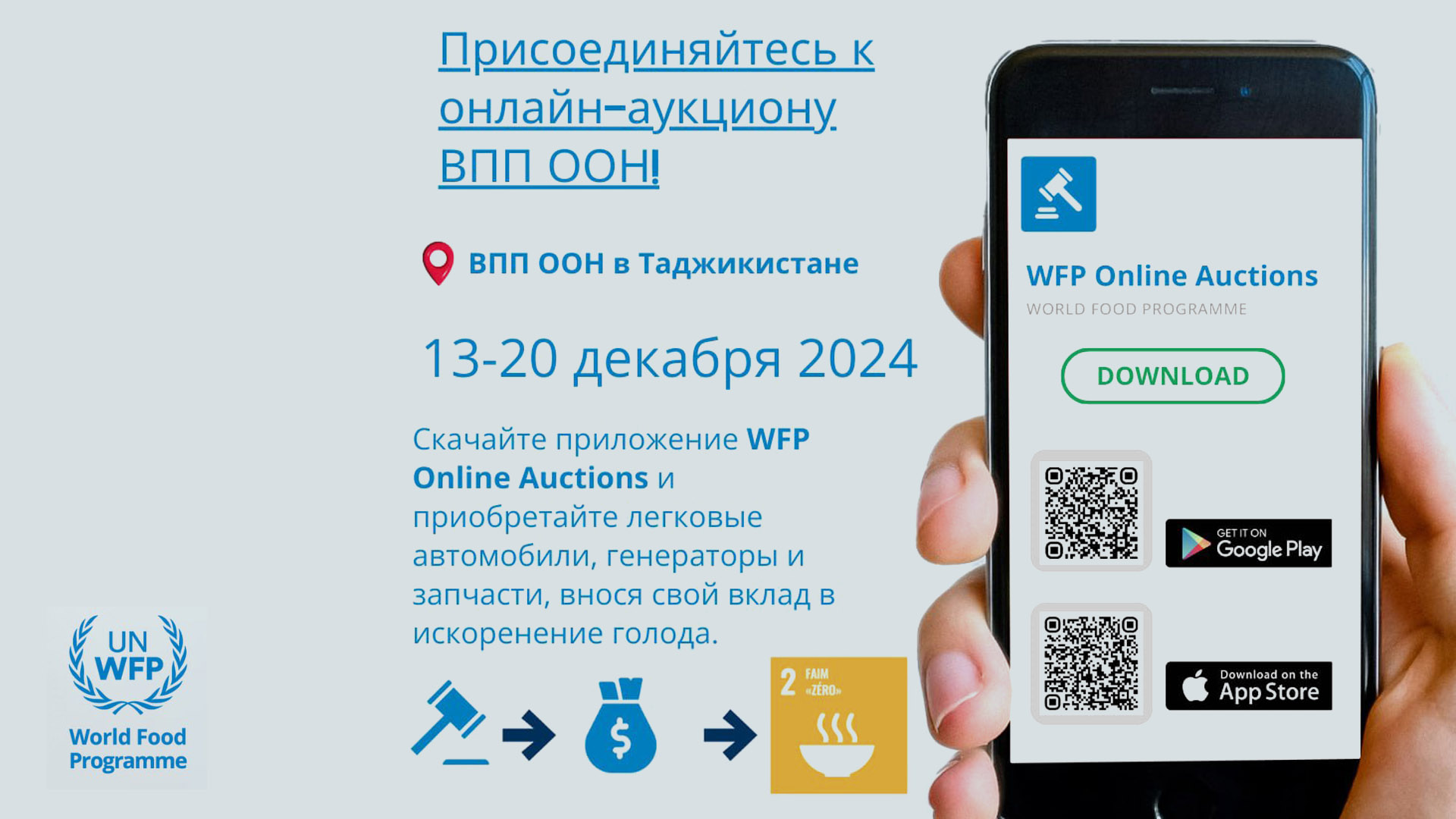 Всемирная продовольственная программа ООН (ВПП) в Таджикистане приглашает принять участие в онлайн-аукционе, который пройдет с 13 по 20 декабря 2024 года.