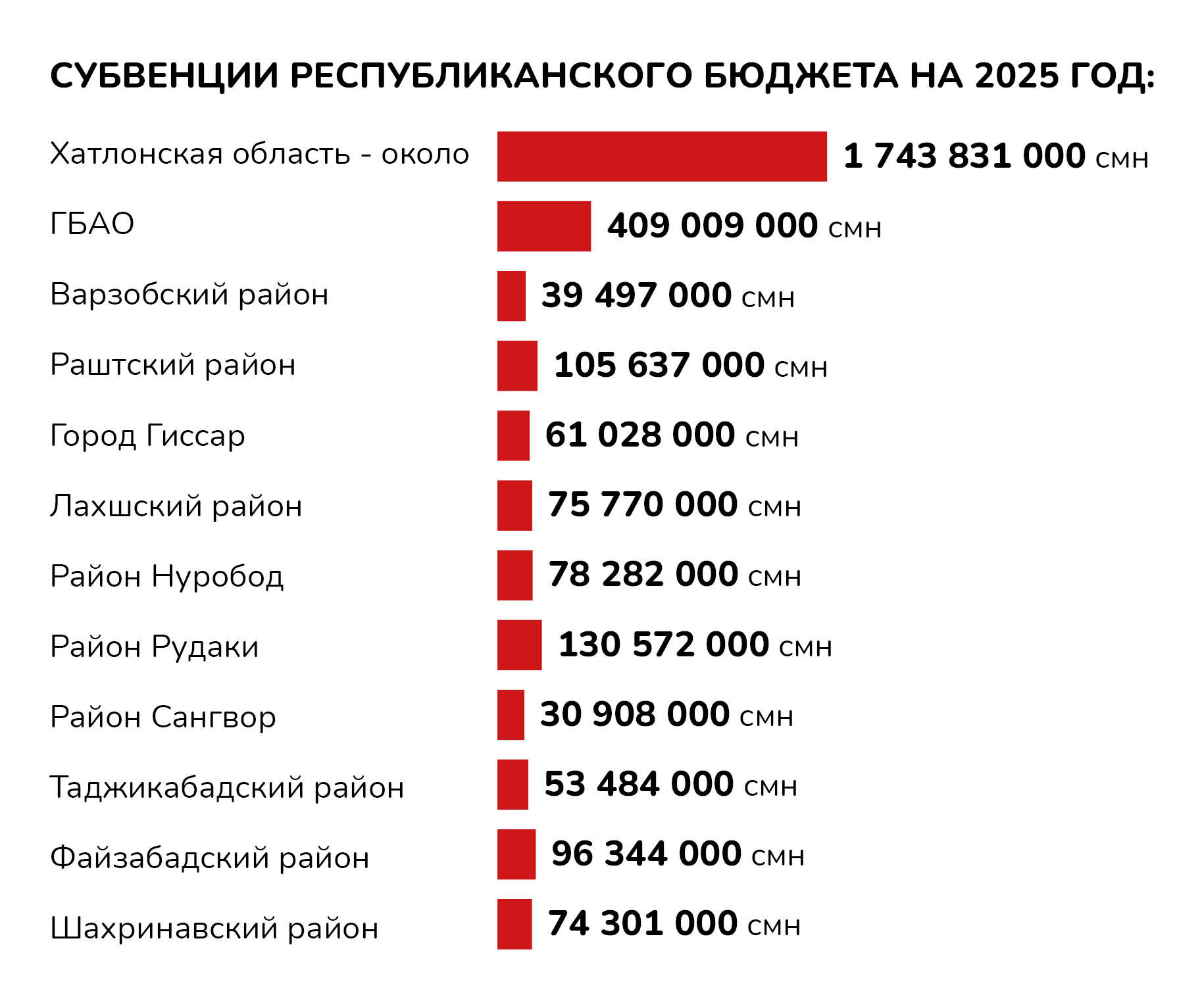 Субвенции на сумму около 2,9 млрд сомони (более $265 млн) заложены в республиканском бюджете на 2025 год. Эти средства направляются в бюджеты Хатлонской области и ГБАО, города Гиссара и девять районов республиканского подчинения.