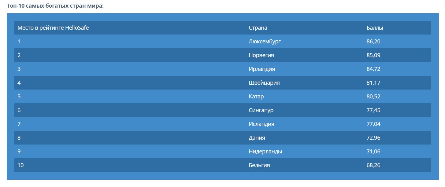 В топ-20 самых процветающих стран в основном входят европейские государства: лидирует Люксембург (86,2), за ним следуют Норвегия (85,12 балла) и Ирландия (84,7 балла), что отражает экономическую мощь этих стран в сочетании с высокими показателями развития человеческого потенциала и равенства доходов».