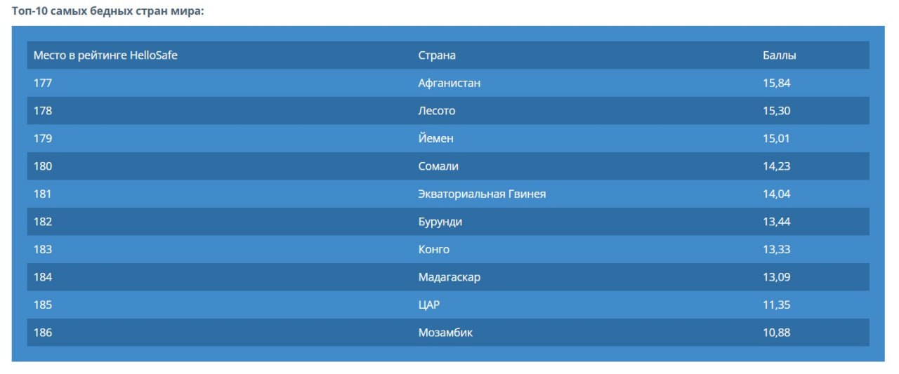 Замыкают рейтинг африканские Мадагаскар (184-ое место), Центральноафриканская республика (185-е) и Мозамбик (186-е).