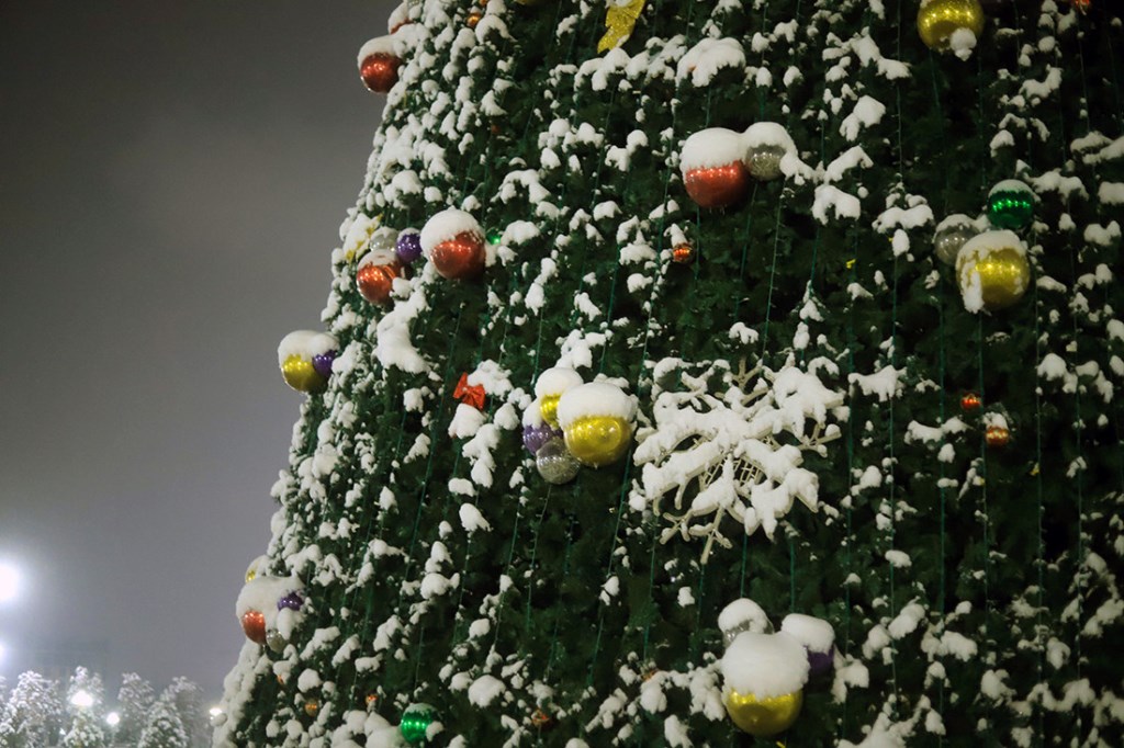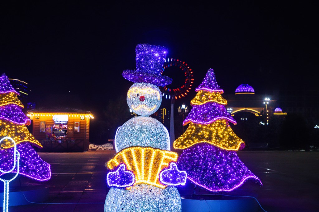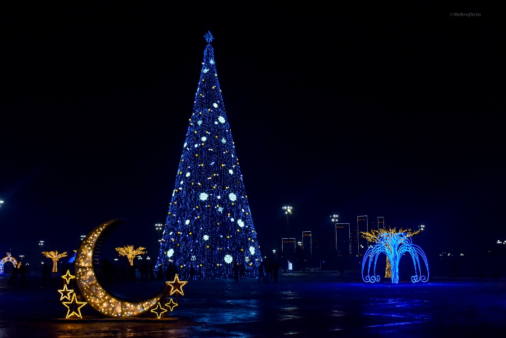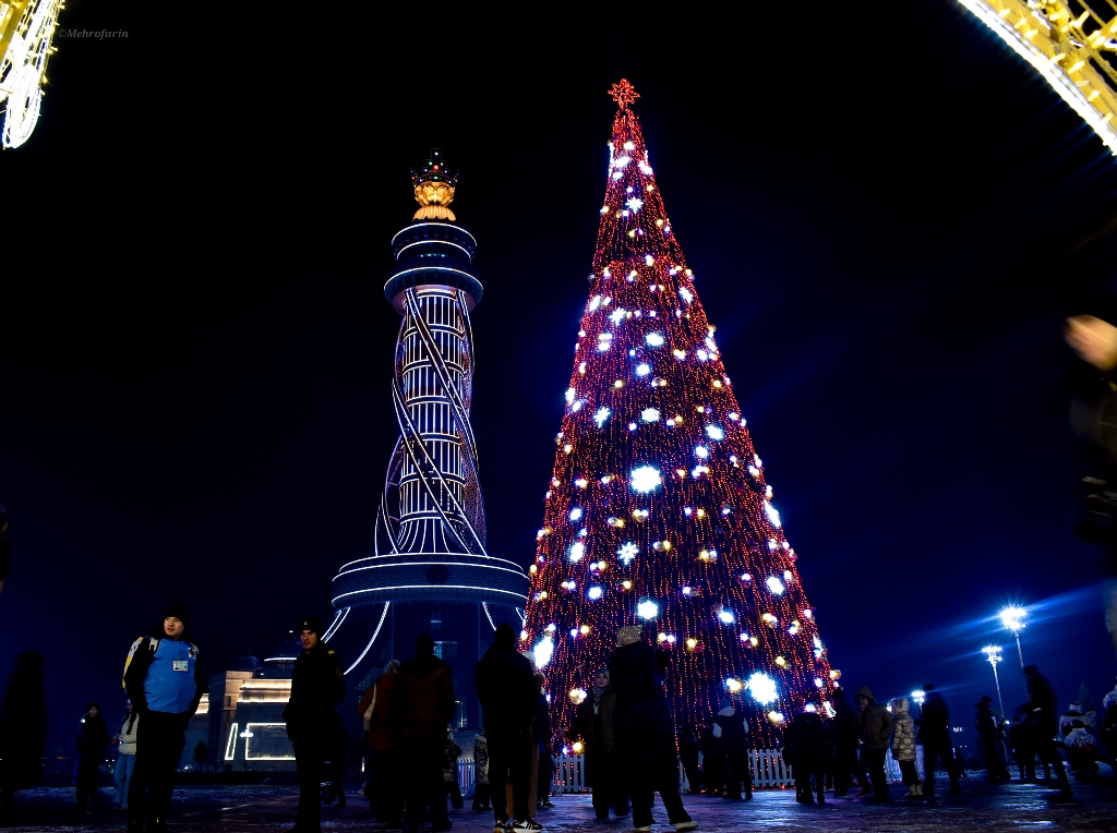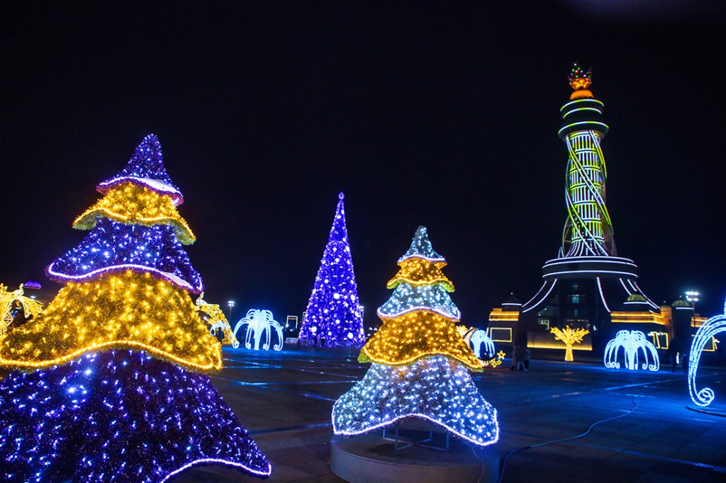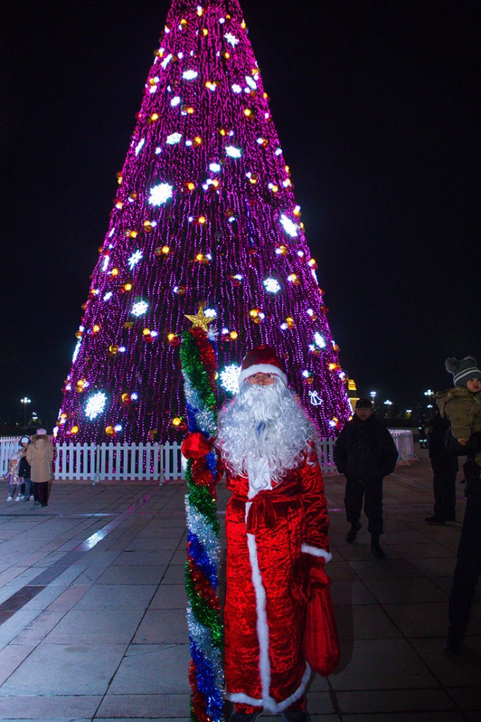 Эта огромная ёлка высотой 30 метров и шириной 16 метров привлекает внимание не только своими размерами, но и праздничным убранством. Она украшена разноцветными иллюминационными огнями и яркими новогодними игрушками, создавая волшебную атмосферу. Вокруг ёлки создан сказочный новогодний городок.