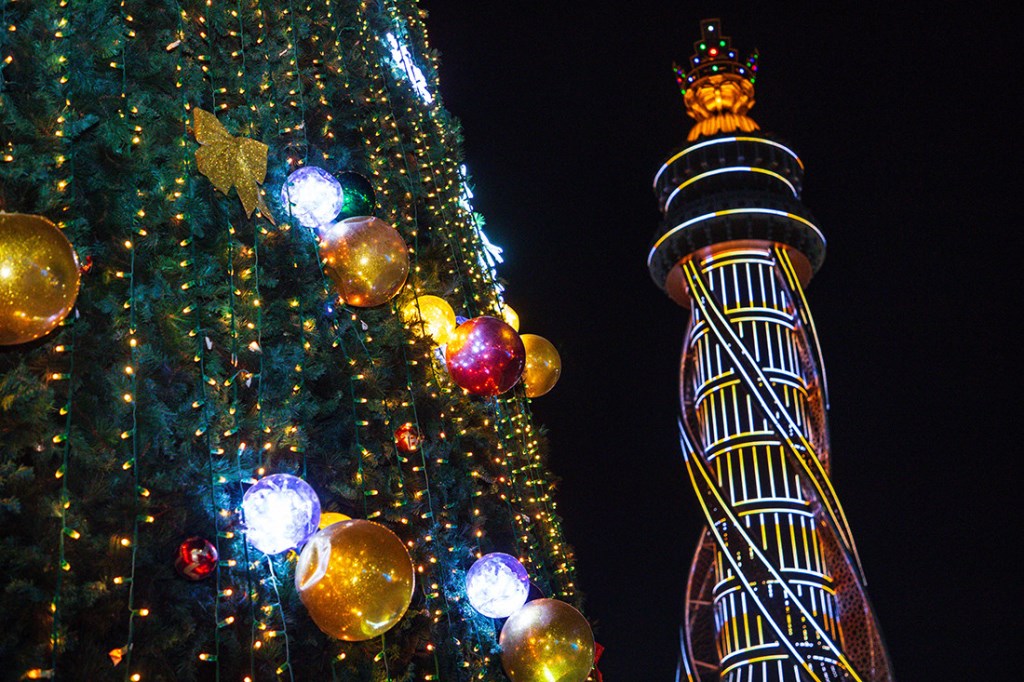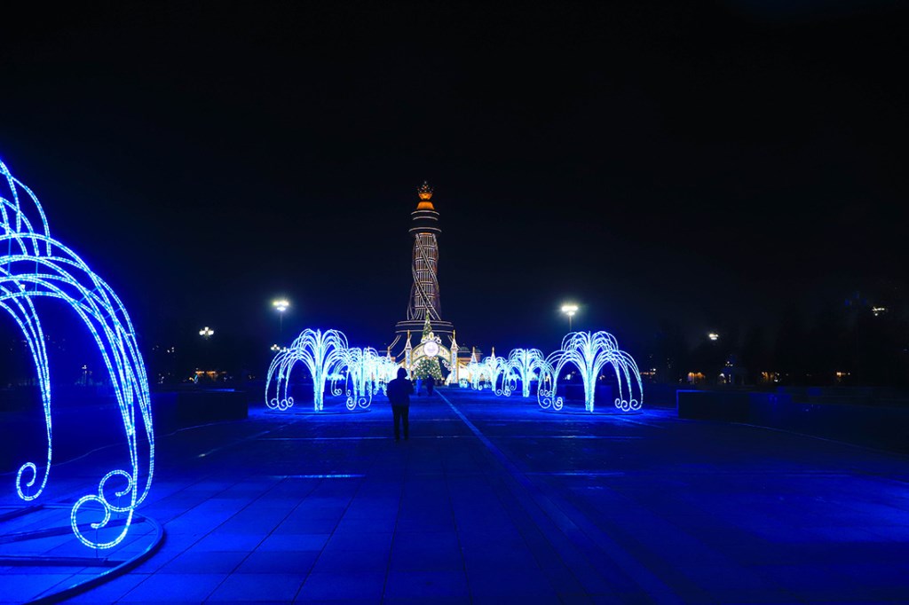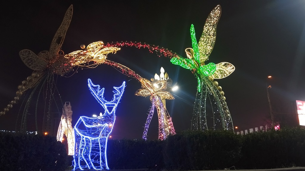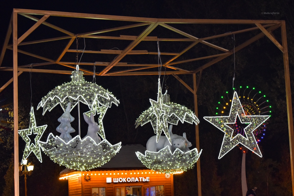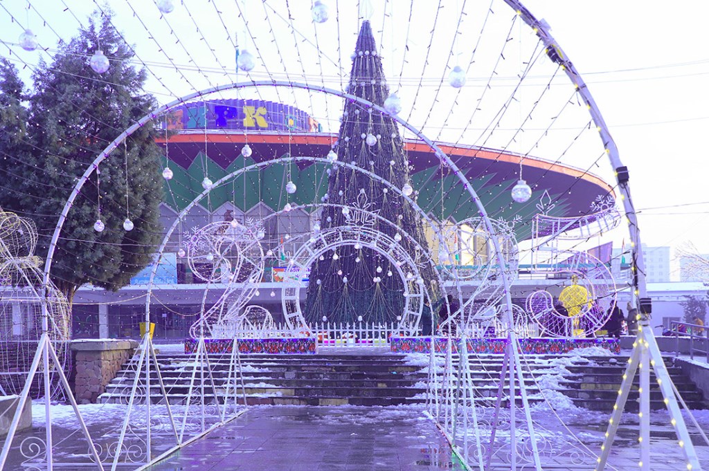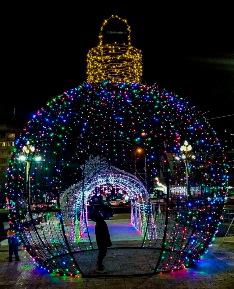 Эта огромная ёлка высотой 30 метров и шириной 16 метров привлекает внимание не только своими размерами, но и праздничным убранством. Она украшена разноцветными иллюминационными огнями и яркими новогодними игрушками, создавая волшебную атмосферу. Вокруг ёлки создан сказочный новогодний городок.