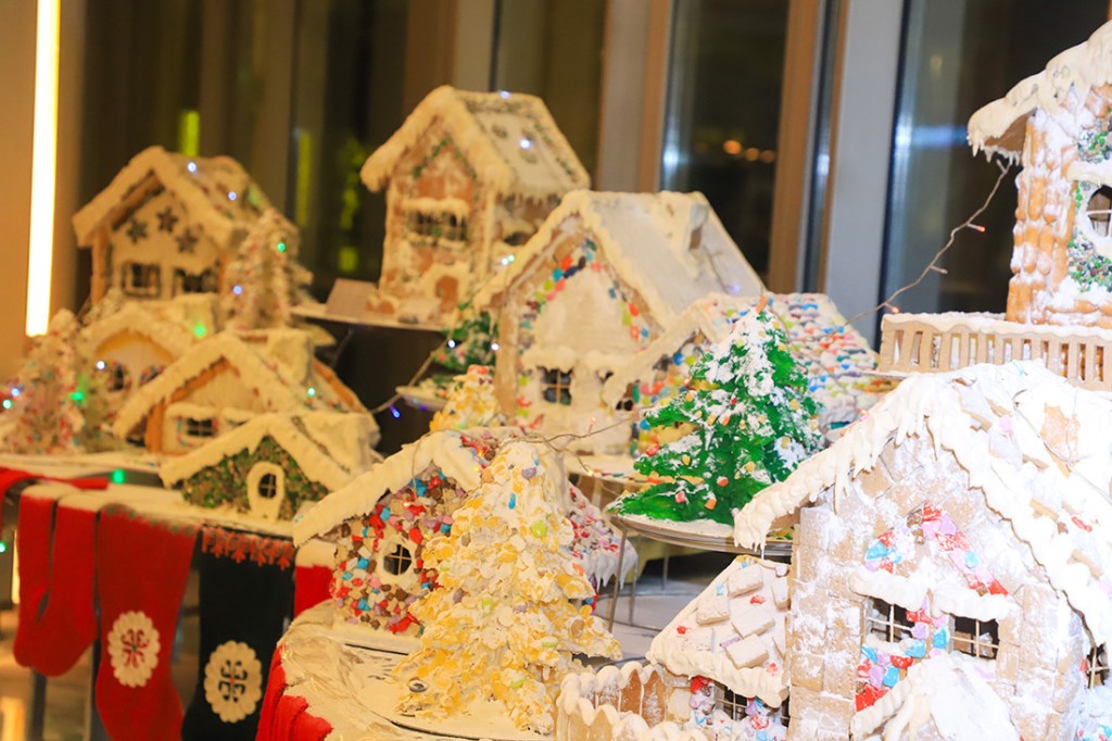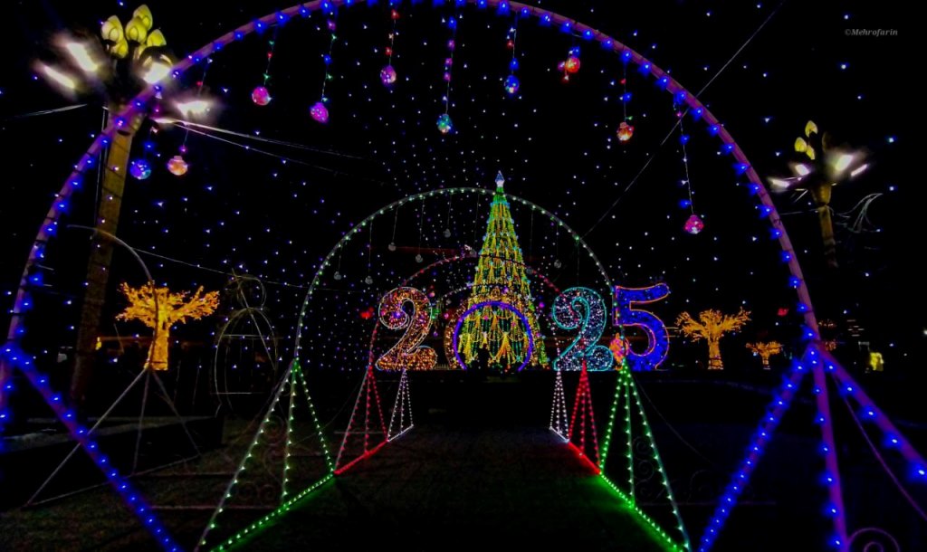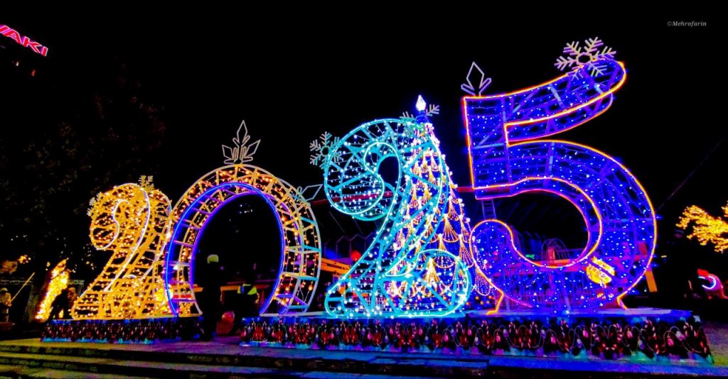 Гостей встречают символические ворота с надписью «2025». Праздничный антураж дополняют разноцветные арки, маленькие зелёные ёлки, улыбающиеся снеговики и таинственный домик Деда Мороза.