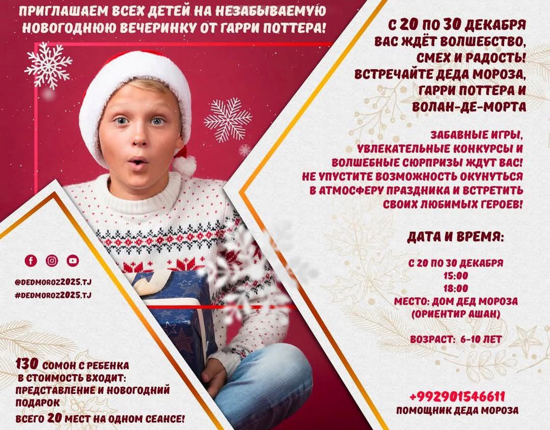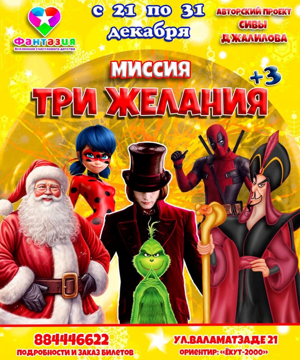 В детском развлекательном центре «Фантазия» с 21 по 31 декабря маленьких гостей ждёт новогоднее представление для детей старше 3-х лет с загадочным названием «Миссия: три желания». Это авторская театральная шоу-программа Сивы Джалилова с любимыми героями мультфильмов и кинофильмов, которая обязательно подарит атмосферу праздника и волшебства! Также малыши получат полную коробку подарков и возможность сфотографироваться на фоне сказочной фотозоны.