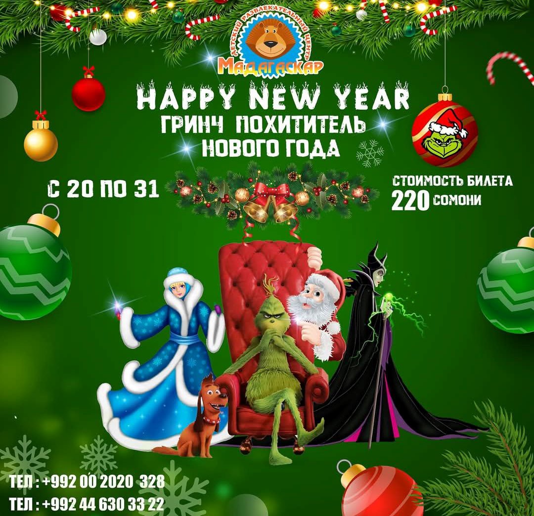 В этот Новый год Детский развлекательный центр «Мадагаскар» приглашает детей от 2 до 16 лет на сказочное мероприятие «Гринч похититель Нового Года!» Показы будут проходить с 20 по 31 декабря. На этот раз Гринч решил украсть Новый Год, забрать все подарки и испортить праздник, но настоящие защитники волшебства – Санта-Клаус и Фея Нового Года помешали его коварным планам.